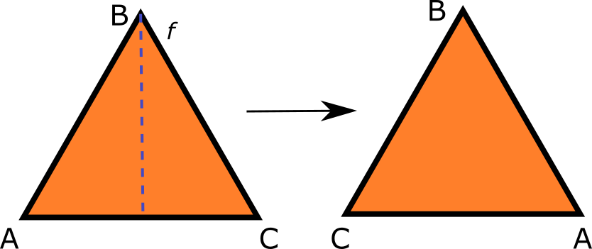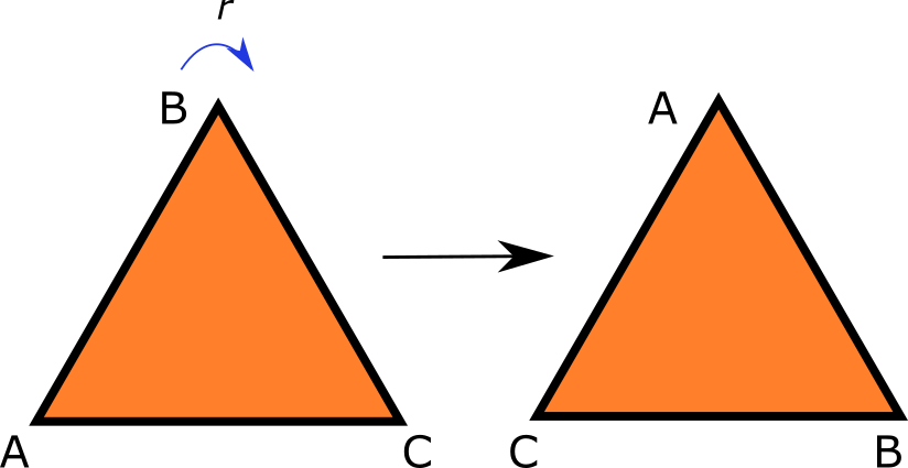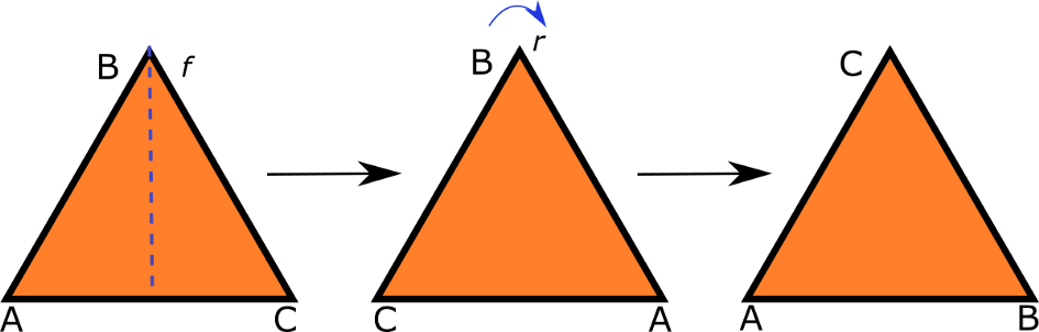 以这里给出的三角形ABC为例。我们可以沿着它的一条平分线进行反射,或者我们可以将它旋转三分之一圈。这里用r代表旋转,用f代表反射。