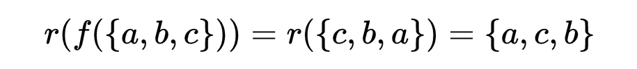 T={a,b,c},G=(r,f,r^2,rf,r^2f)。你可以认为这是在描述一个等边三角形的属性:它是一个由三点组成的集合,其中某些旋转和反射(G中的那些)让它保持不变。我们现在称这些为对称性,但在不久之后会再一次完善定义。