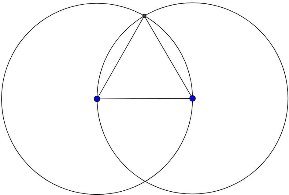 因为这两个圆共享一个半径,而且所有三个点都位于两个圆上,所以任何两个圆之间的距离必须是相同的。稍后我们将看到这意味着什么。