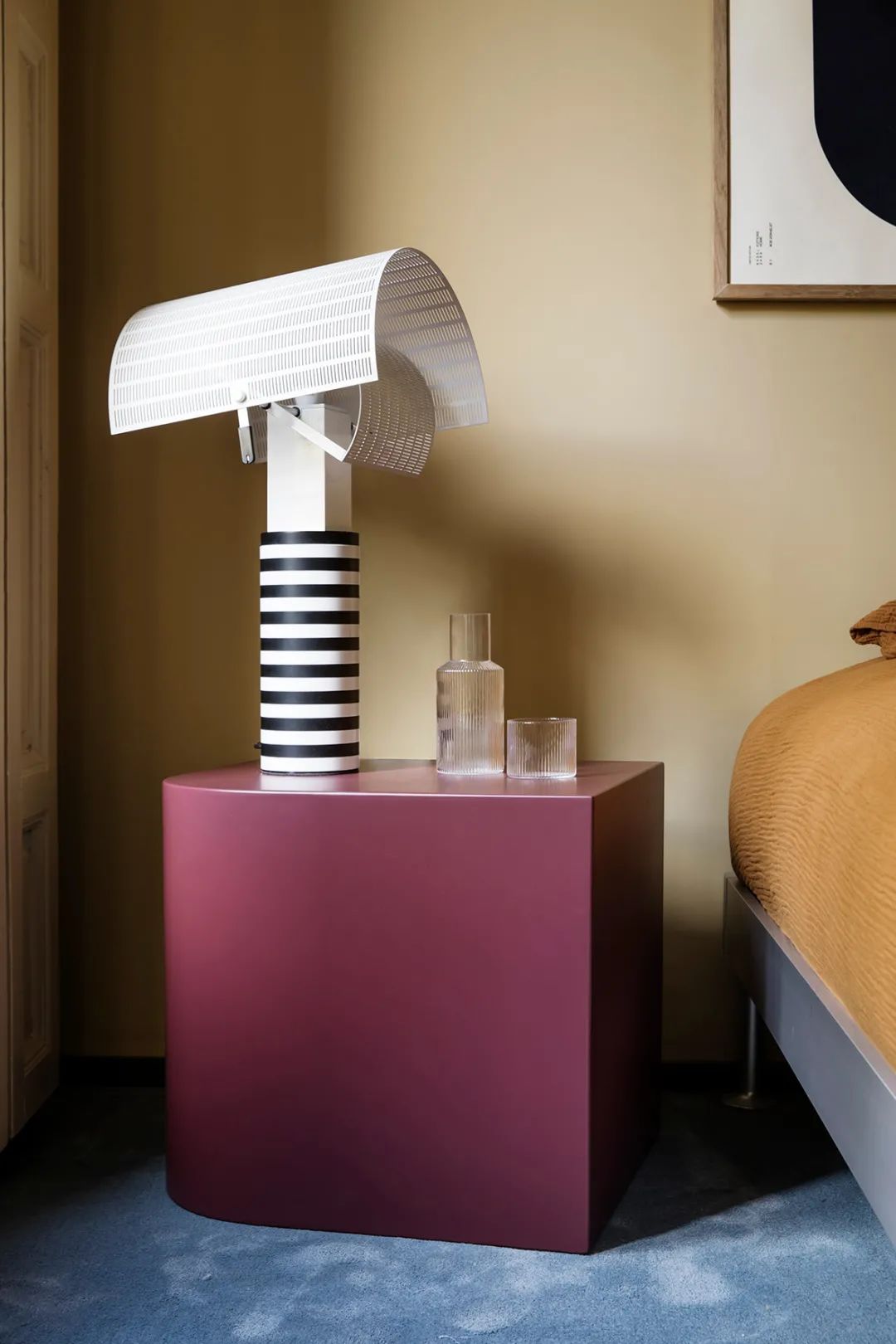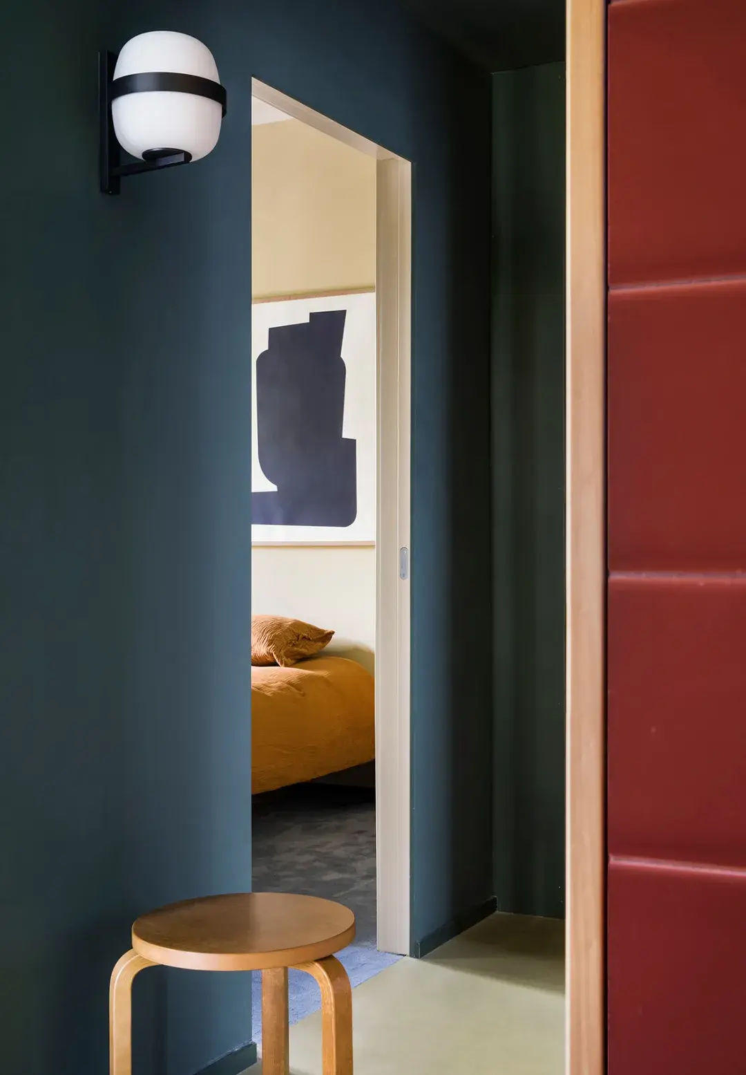 卧室是房子里最温暖、最温馨的空间,色彩的使用成为主角,地毯的蓝色与定制衣柜的绿色融为一体,而赤陶床上用品与床头柜上的栗色相得益彰,通过几乎中性的黄油色墙壁和间接照明,实现了一种欢腾的平静感,有助于促进休息。