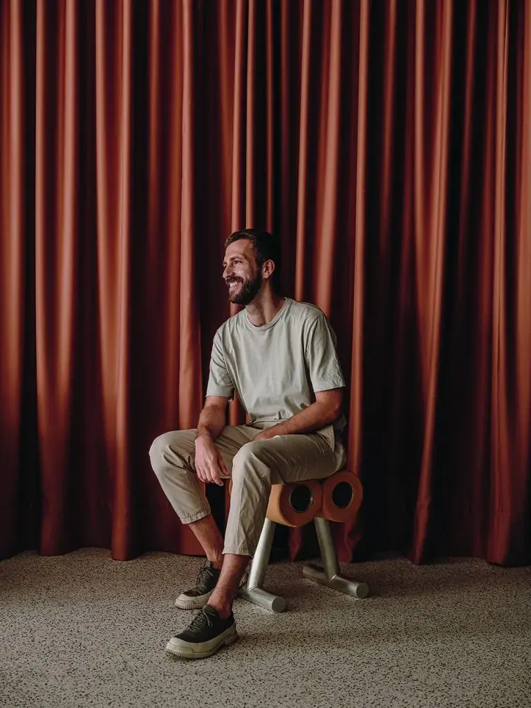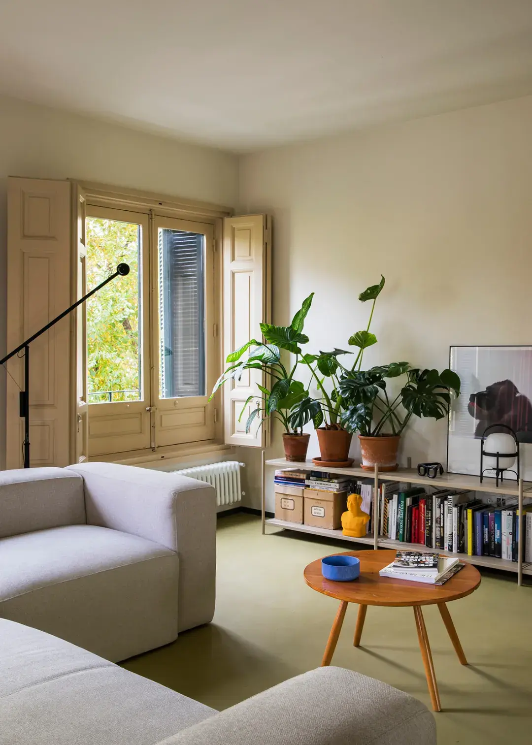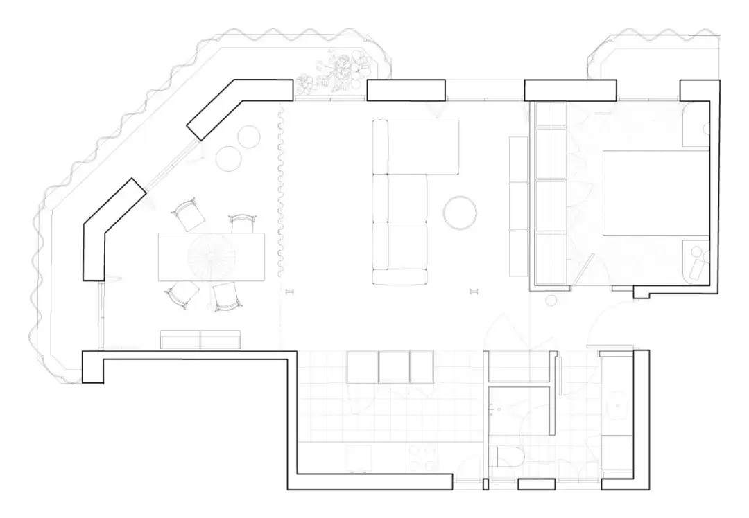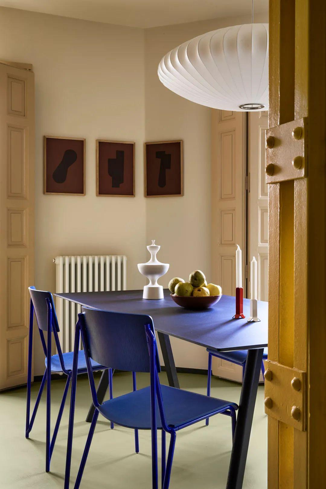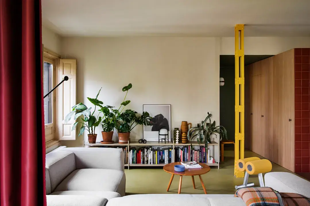 Estudio Reciente设计了一套充满秘密惊喜的公寓,住宅采用倒角设计有 5 个临街阳台,被组织成两个小房间,一间餐厅、客厅、厨房和浴室,设计师采用更现代的方法优先考虑的是家庭的社交空间,餐厅、起居室和厨房被整合为一个 45 平方米的房间,墙壁涂有中性浅米色底色的房间,设计师选择了一种微妙的绿色石灰砂浆地板,再加上金属柱子、鲜红色的窗帘隔断和配色大胆的家具给空间营造出一种充满活力的氛围,色彩感强烈而平衡。