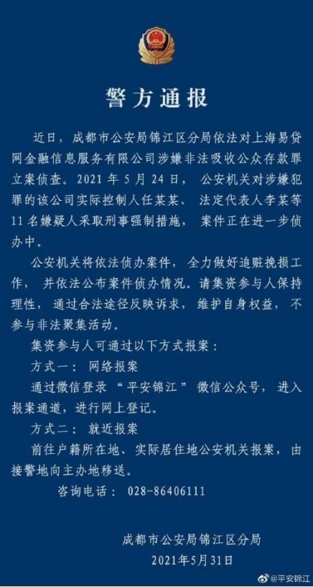 5月31日,四川省成都市公安局锦江区分局发布警情通报称,近日,成都市公安局锦江区分局依法对上海易贷网金融信息服务有限公司涉嫌非法吸收公众存款罪立案侦查。5月24日,公安机关对涉嫌犯罪的该公司实际控制人任某某、法定代表人李某等11名嫌疑人采取刑事强制措施。