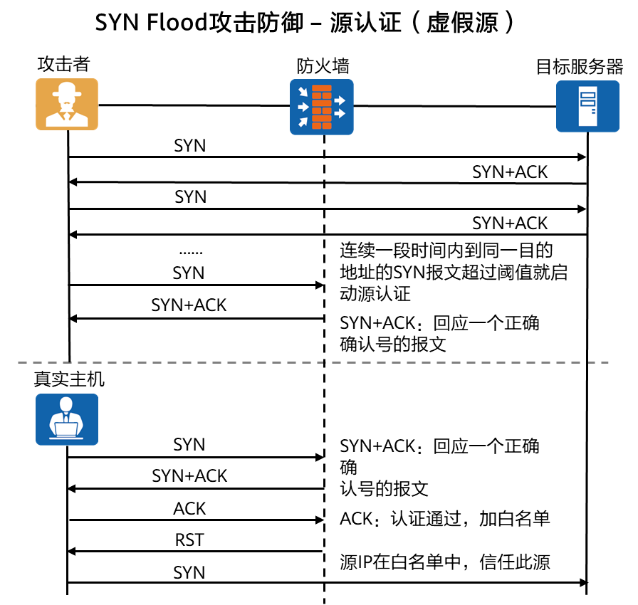 SYN Flood攻击是通过伪造一个源地址的SYN报文,发送给受害主机,受害主机回复SYN+ACK报文给这些地址后,不会收到ACK报文,导致受害主机保持了大量的半连接,直到超时。这些半连接可以耗尽主机资源,使受害主机无法建立正常TCP连接,从而达到攻击的目的。