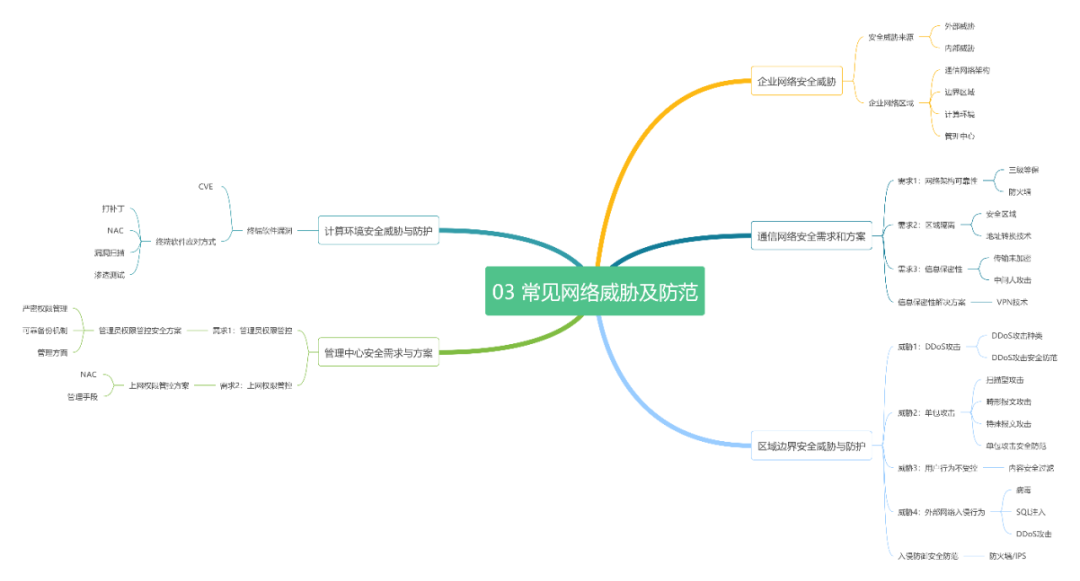 外部威胁:来自企业网络外部的安全威胁,如DDoS攻击,病毒、木马、蠕虫等网络入侵,网络扫描,垃圾邮件,钓鱼邮件,针对Web服务器的攻击等;内部威胁:网络结构不可靠,网络未隔离,终端存在漏洞,员工行为不受控,信息安全违规操作,信息泄露,恶意员工,权限管理混乱,非法接入等。为了有针对性地防范企业网络安全威胁,企业工程师会根据威胁来源将网络划分为不同区域,企业网络不同区域的安全威胁及防范措施: