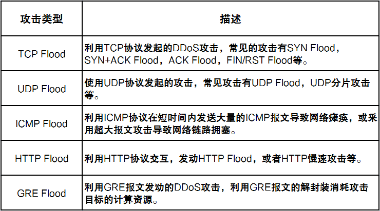 根据攻击报文类型的不同,可以分为TCP Flood、UDP Flood、ICMP Flood、HTTP Flood和GRE Flood等。