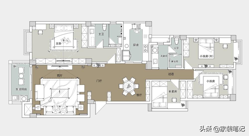 原来的结构比较好,所以平面改造大致没有变动,在原有的基础上进行了细化的设计处理。在入户的左右两边各设计一组柜子,正对面设计端景,自然地形成了入户玄关;长辈房门洞改变了地方,选择做榻榻米的形式,能够让原本不大的卧室,变得利用率更高;厨房和小孩房都把阳台包进来了,扩大其面积,所以只有一个阳台,只能做为生活阳台使用。