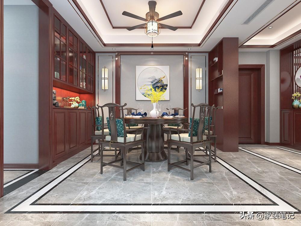 酒红色系的中式风餐厅,有着很传统的氛围,为了让整个空间看上去不那么老气,所以在墙面嵌入了几圈金属线条,弱化一些沉闷老气感,增加一些现代的新时尚进去。