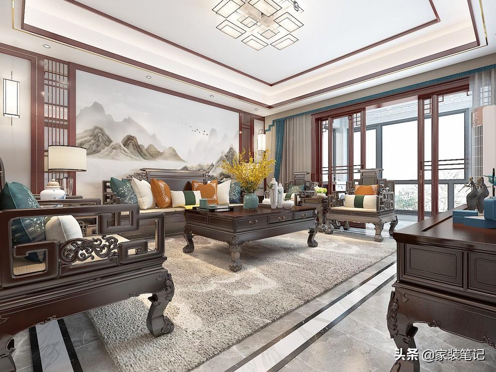 沙发背景墙中间是一幅气势恢宏的中式山水画,若隐若现的图案,给了空间一种自然的气息。沙发墙旁边的圆形造型,把国潮的意趣引入家庭氛围中,顶上还有华丽的中式主灯,让人置身其中更能得到和谐的美感。
