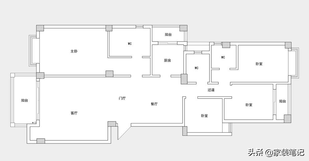 原始结构是一个横向的“一”字排开户型,进来入户没有玄关,打开房门对客餐厅就是一览无遗,总共家里面原始结构里面有三个阳台,分别在客厅旁边一个、厨房里面一个,还有一个卧室里面一个。整个户型的缺点还是比较少的,结构明确,除了主卧室大一些,其它三个卧室都属于紧凑型的。