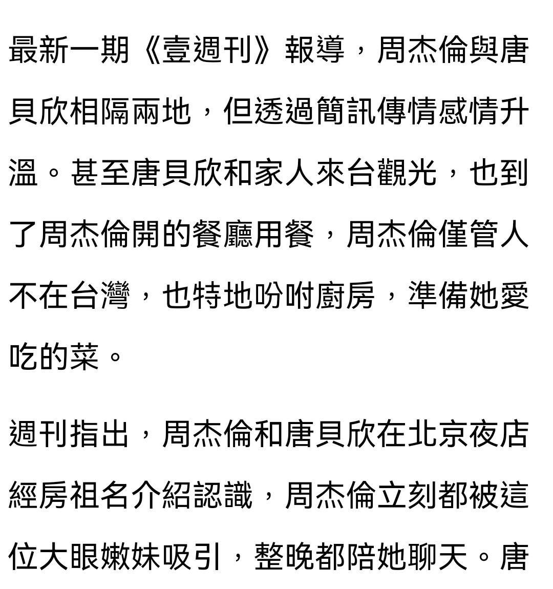报道里很多细节:唐贝欣和家人到台湾观光去周杰伦开的餐厅吃饭,周杰伦本人不在但还是吩咐厨房给她做爱吃的菜。