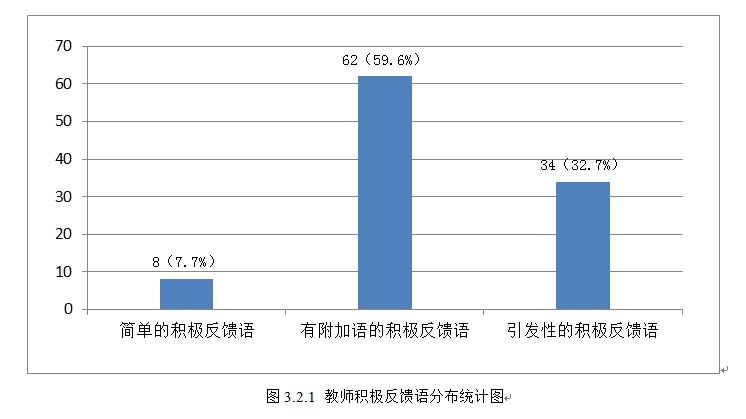 图3.2.1显示:简单的积极反馈语是本节课该教师使用最少的积极反馈语类型,共计8次,仅占积极反馈语总数的7.7%;教师引发性积极反馈语共计34次,占32.7%;有附加语的积极反馈语占59.6%,明显高于其他反馈语类型比例。这表明,该教师较擅长使用引发性的积极反馈语,习惯对学生的回答进行积极反馈后附加上其它教学信息,激发学习兴趣,进一步拓展相关教学内容。