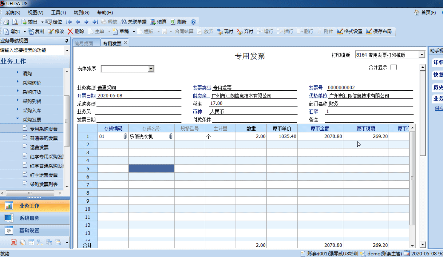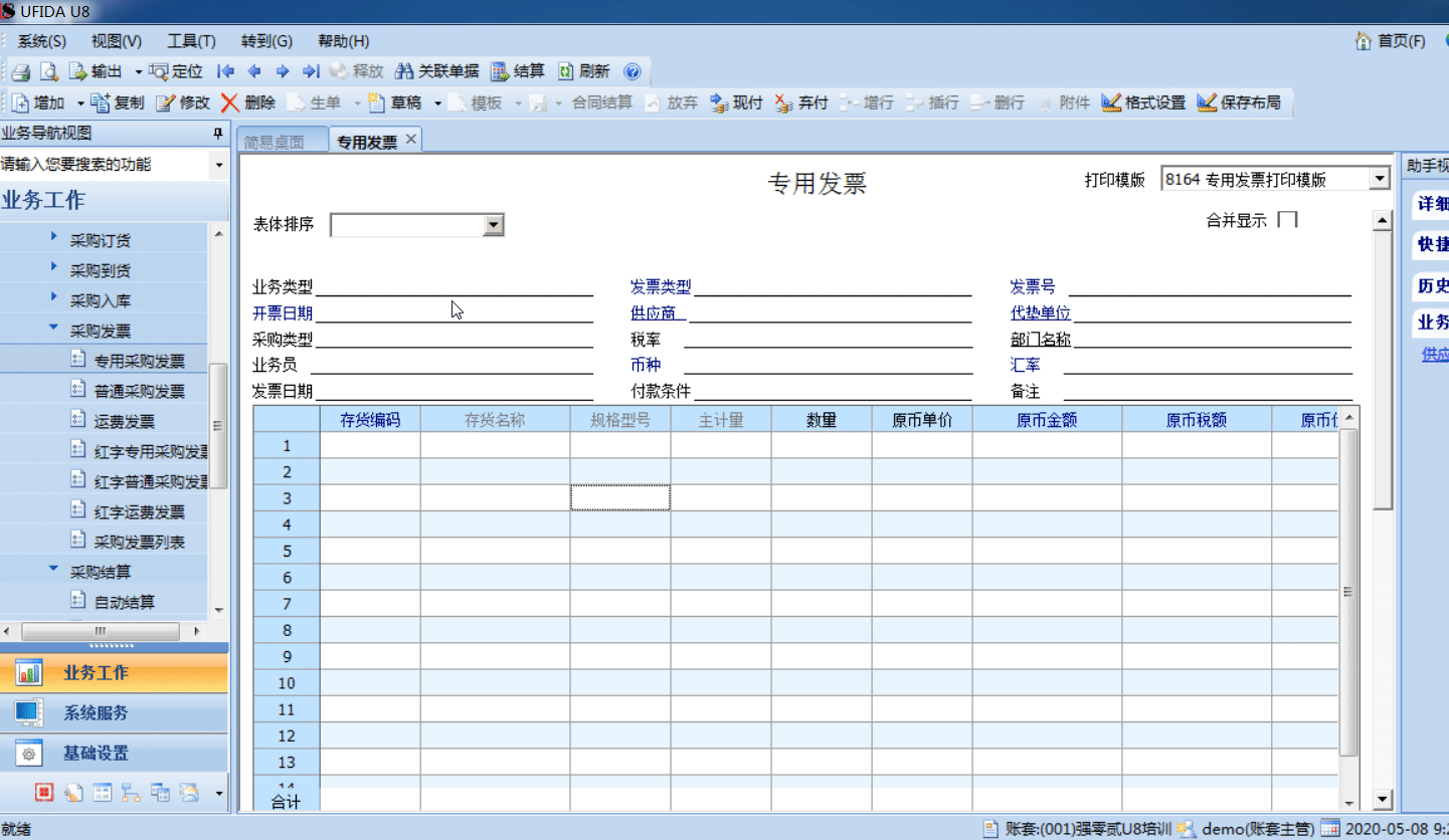 操作路径:【业务工作】-【供应链】-【采购管理】-【采购发票】-【专用采购发票】