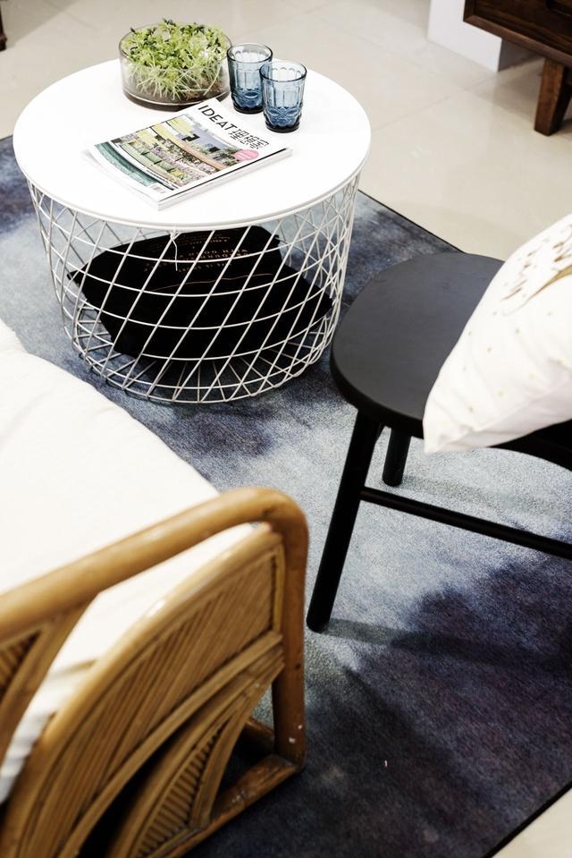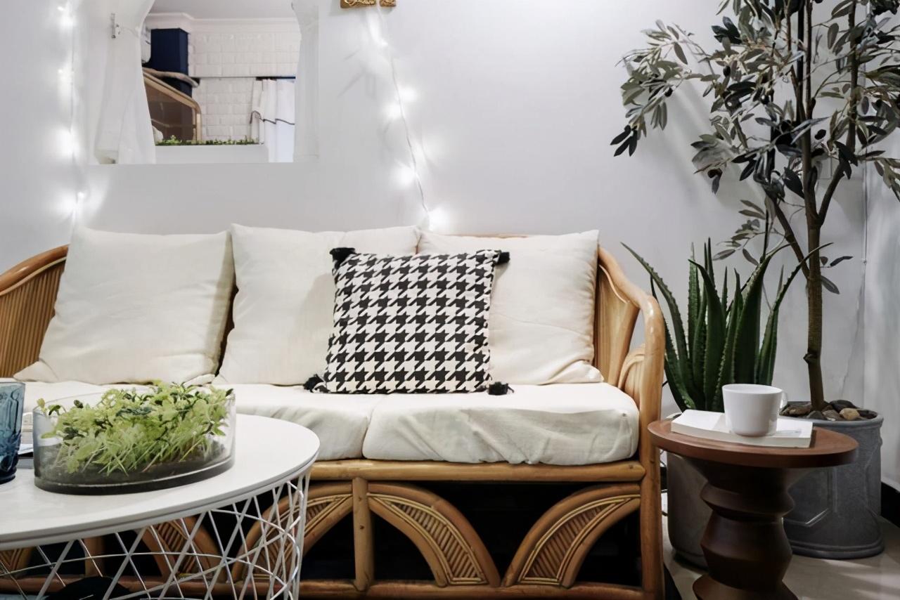 电视墙对面靠墙摆放一个复古式藤编沙发,搭配米色坐垫和抱枕,十分舒适。对面放一个轻盈通透的进入编筐式圆形小茶几,上面摆放着精致的水具和绿植等,搭配旁边的小座椅,这里就是会客休闲工作区域了,让小空间发挥更大效能。
