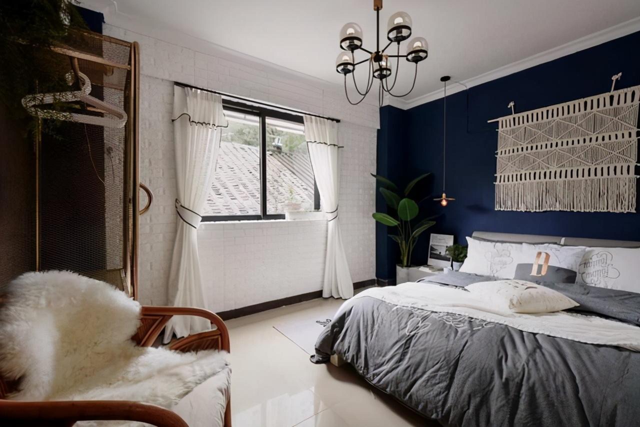 主卧空间没有改动,浅灰色软包床头及床品的大床,非常轻柔舒适,在宁清的深蓝色背景墙衬托下,营造出清新舒适轻松的休憩氛围。