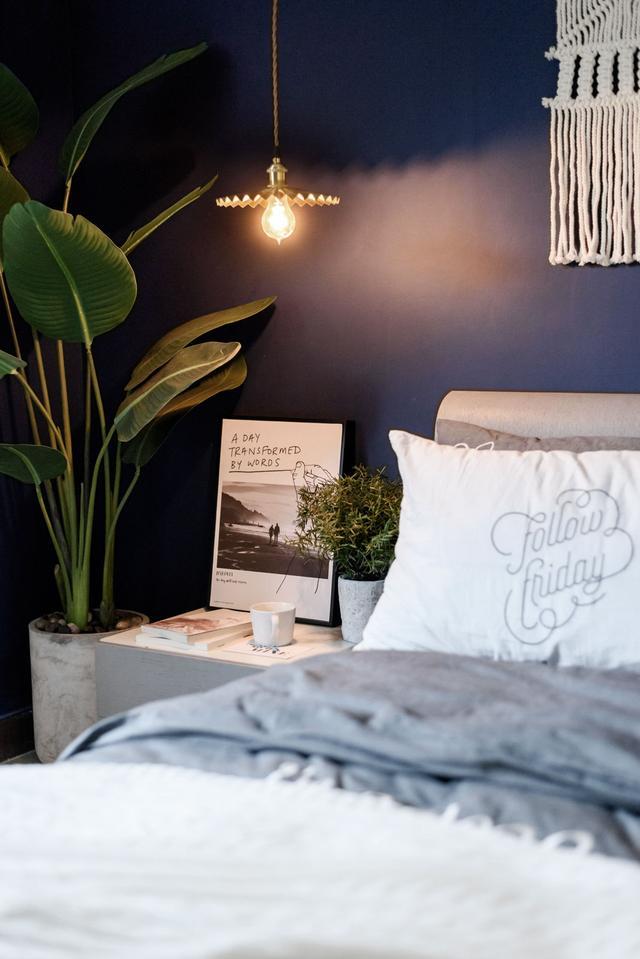 床头柜侧面还摆放一盆天堂鸟绿植,在温馨的小吊灯映衬下,让室内充满生机和活力。