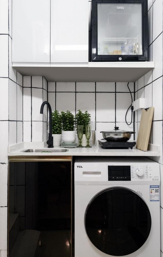 厨房在餐厅左转位置,设计在一个凹槽内,尽管空间十分狭小,台面下还塞下洗衣机,让小巧实用厨房功能更加齐全,十分整洁清爽。