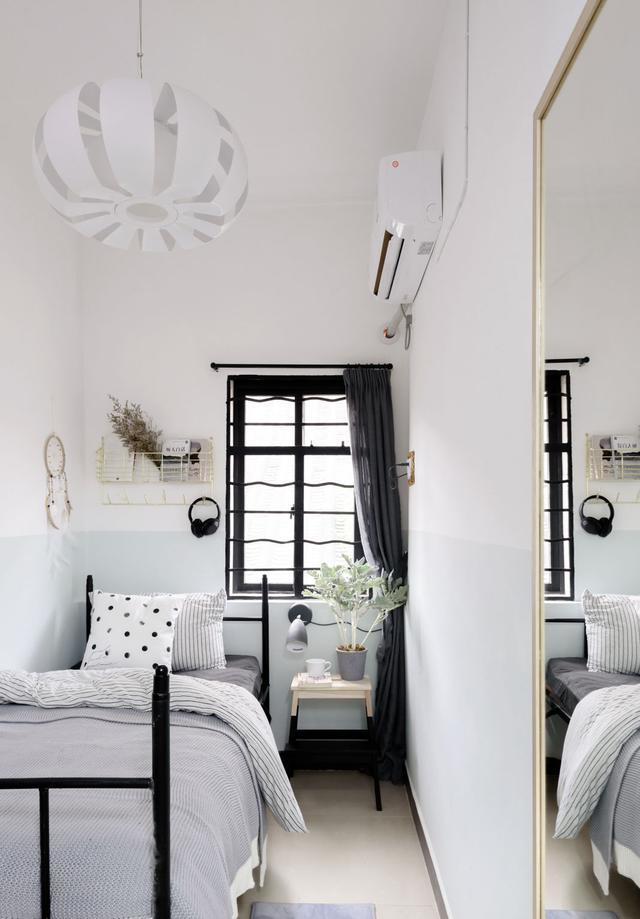 儿童房空间比较小,摆放一张铁艺睡床后就剩一条过道了,但布置的简洁清新,安静舒适。