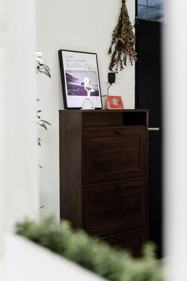 从入户门进来就是卡餐厅,没有独立玄关,因此夫妻在进门右侧墙面放一个黑胡桃木色实木玄关鞋柜,满足家人入户鞋子等收纳的需要。