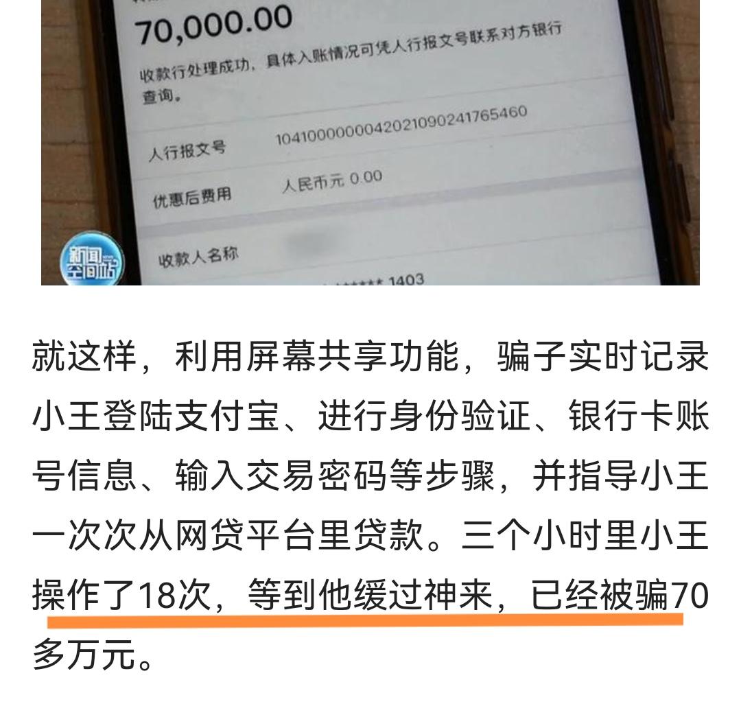 魔高一丈,对方通过这个软件实现了屏幕共享,获取王同学的个人信息,以及登录他的个人账号,并且让他去网络平台贷款。而这些贷款都被犯罪分子转到了他们的账号,反反复复操作了18次之后,王同学共计被骗走70万元。