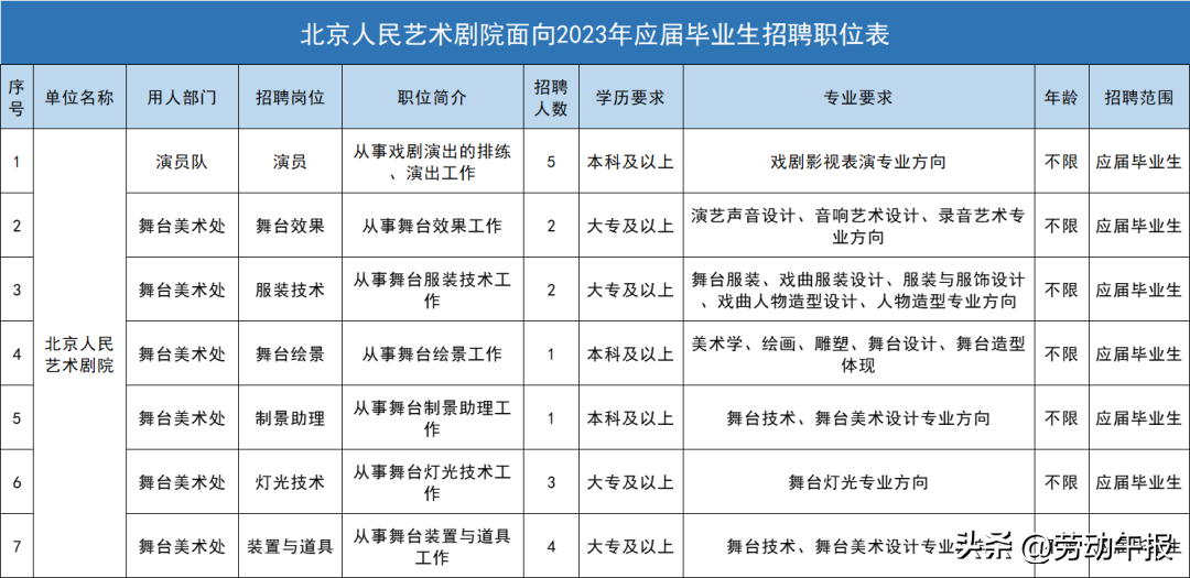 招聘职位有:演员、灯光技术、服装技术、舞台效果、装置与道具、舞台绘景、制景助理共7个岗位,具体条件及要求详见《北京人民艺术剧院面向2023年应届毕业生招聘职位表》。