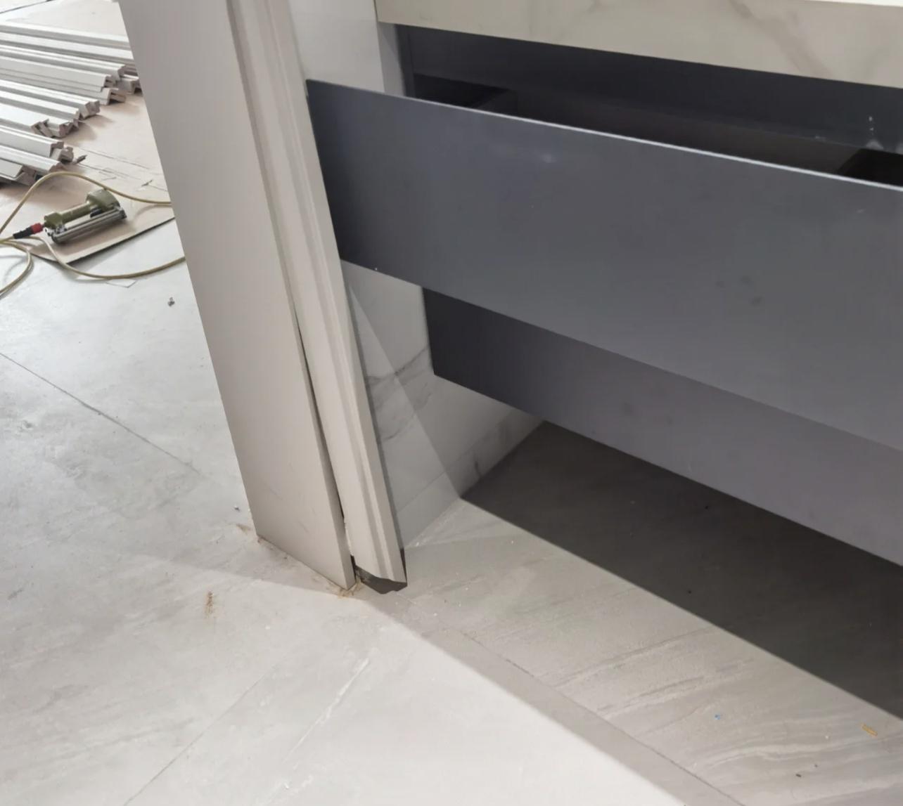 浴室柜与墙面合缝,忽略了门套厚度(如上图),抽屉刚好被门套卡住拉不开。
