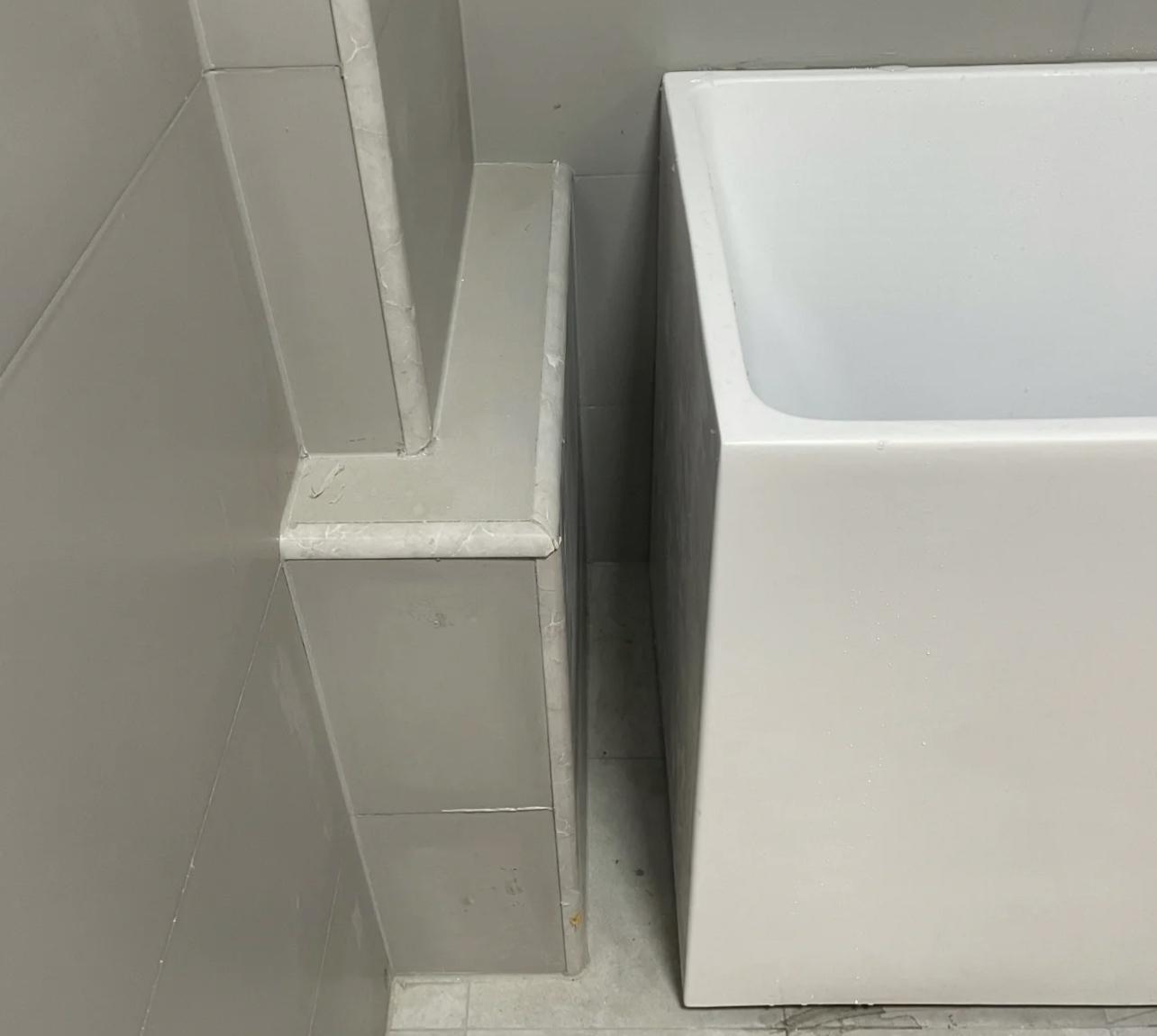 对于有包管柱的卫生间,明明可以选择刚合适的浴缸,在无包管处将浴缸摆好,再推进去,上图却按照包管墙距买的浴缸,导致缝隙过大,同样翻车了。