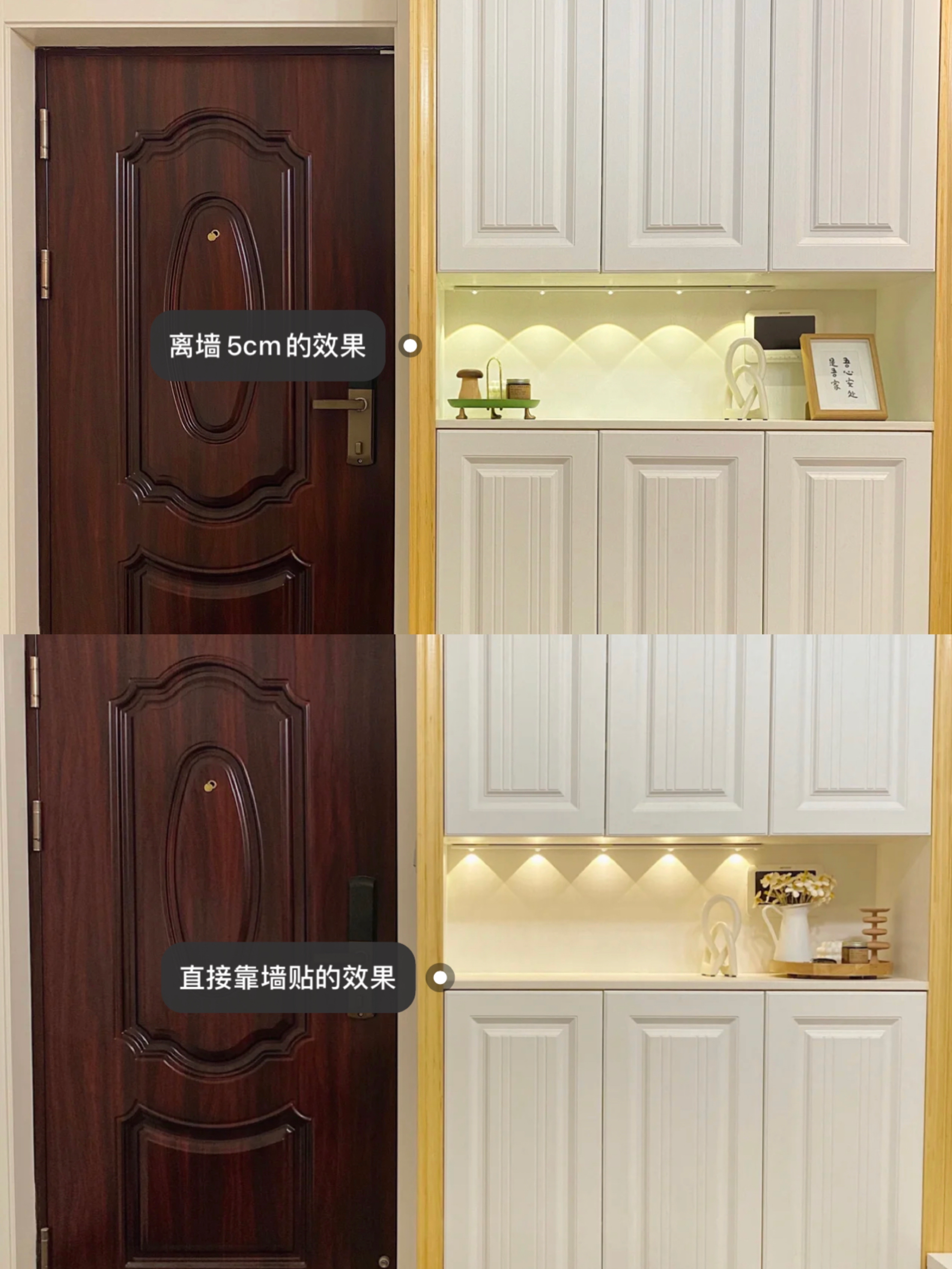 仔细观察灯光照射位置也会发现,靠墙的小山丘灯,光圈是集中在玄关顶板的,而离墙5cm的小山丘灯,灯光会向下落,打在柜体中间,有洗背景的效果。
