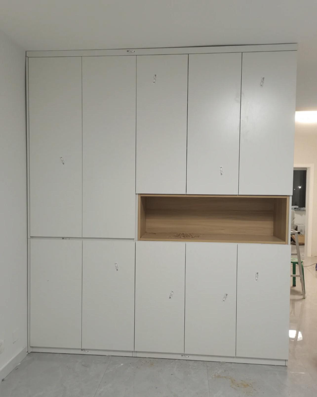 另外一种情况是,有封板的衣柜顶侧出现缝隙,这类型小的缝隙,可以通过木工调整顶侧封板厚度补救,不细看看不出来,稍微大的缝隙,只能同上了。