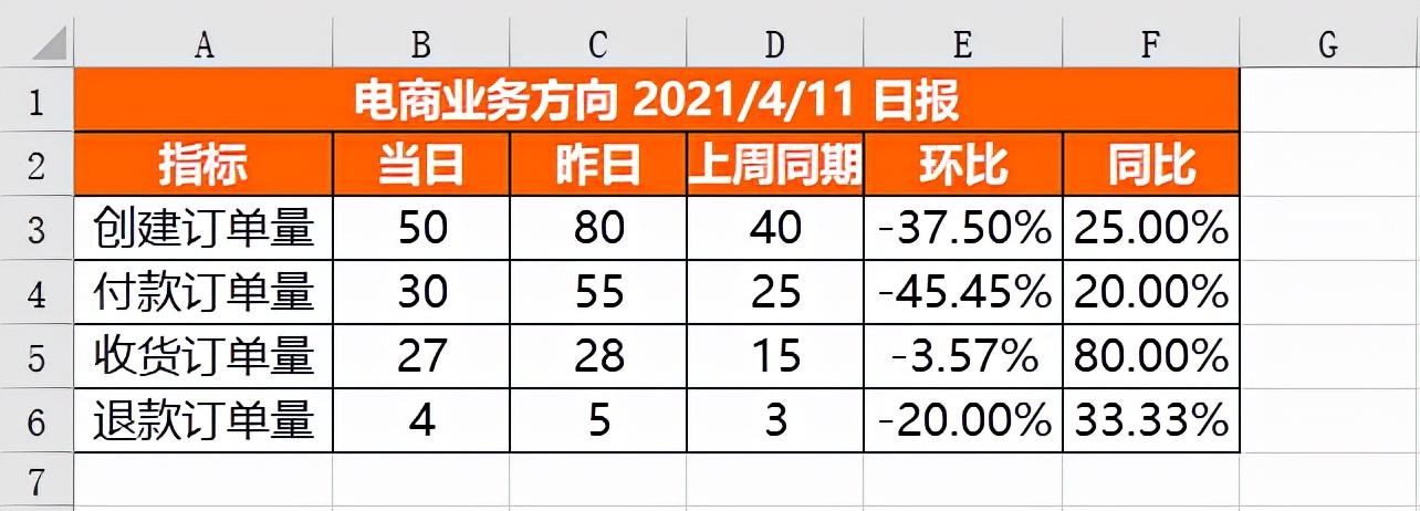 from openpyxl import Workbookfrom openpyxl.utils.dataframe import dataframe_to_rowsfrom openpyxl.styles import colorsfrom openpyxl.styles import Fontfrom openpyxl.styles import PatternFillfrom openpyxl.styles import Border, Sidefrom openpyxl.styles import Alignmentwb = Workbook()ws = wb.activefor r in dataframe_to_rows(df_view,index = True,header = True): ws.append(r) #第二行是空的,删除第二行ws.delete_rows(2)#给A1单元格进行赋值ws['A1'] = '指标'#插入一行作为标题行ws.insert_rows(1)ws['A1'] = '电商业务方向 2021/4/11 日报'#将标题行的单元格进行合并ws.merge_cells('A1:F1') #合并单元格#对第1行至第6行的单元格进行格式设置for row in ws[1:6]: for c in row: #字体设置 c.font = Font(name = '微软雅黑',size = 12) #对齐方式设置 c.alignment = Alignment(horizontal = "center") #边框线设置 c.border = Border(left = Side(border_style = "thin",color = "FF000000"), right = Side(border_style = "thin",color = "FF000000"), top = Side(border_style = "thin",color = "FF000000"), bottom = Side(border_style = "thin",color = "FF000000"))#对标题行和表头行进行特殊设置for row in ws[1:2]: for c in row: c.font = Font(name = '微软雅黑',size = 12,bold = True,color = "FFFFFFFF") c.fill = PatternFill(fill_type = 'solid',start_color='FFFF6100')#将环比和同比设置成百分比格式 for col in ws["E":"F"]: for r in col: r.number_format = '0.00%'#调整列宽ws.column_dimensions['A'].width = 13ws.column_dimensions['E'].width = 10#保存调整后的文件 wb.save(r'D:\Data-Science\share\excel-python报表自动化\核心指标.xlsx')运行上面代码会得到如下结果: