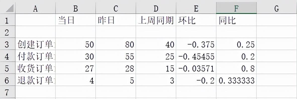 #导入文件import pandas as pddf = pd.read_excel(r'D:\Data-Science\share\excel-python报表自动化\sale_data.xlsx')#构造同时获取不同指标的函数def get_data(date): create_cnt = df[df['创建日期'] == date]['order_id'].count() pay_cnt = df[df['付款日期'] == date]['order_id'].count() receive_cnt = df[df['收货日期'] == date]['order_id'].count() return_cnt = df[df['退款日期'] == date]['order_id'].count() return create_cnt,pay_cnt,receive_cnt,return_cnt #假设当日是2021-04-11#获取不同时间段的各指标值df_view = pd.DataFrame([get_data('2021-04-11') ,get_data('2021-04-10') ,get_data('2021-04-04')] ,columns = ['创建订单量','付款订单量','收货订单量','退款订单量'] ,index = ['当日','昨日','上周同期']).Tdf_view['环比'] = df_view['当日'] / df_view['昨日'] - 1df_view['同比'] = df_view['当日'] / df_view['上周同期'] - 1df_view运行上面代码会得到如下结果: