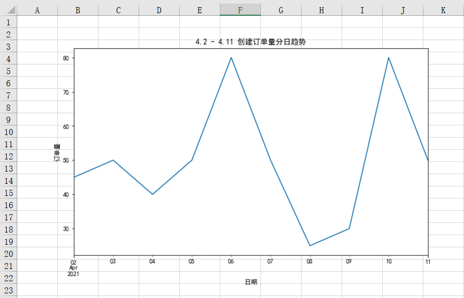 from openpyxl import Workbookfrom openpyxl.drawing.image import Imagewb = Workbook()ws = wb.activeimg = Image(r'D:\Data-Science\share\excel-python报表自动化\4.2 - 4.11 创建订单量分日趋势.png')ws.add_image(img, 'A1')wb.save(r'D:\Data-Science\share\excel-python报表自动化\4.2 - 4.11 创建订单量分日趋势.xlsx')运行上面代码会得到如下结果,可以看到图表已经被成功插入到Excel中: