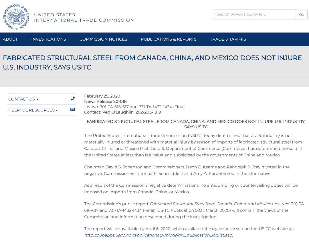 美国国际贸易委员会对涉华预制钢结构作出双反产业损害否定性终裁