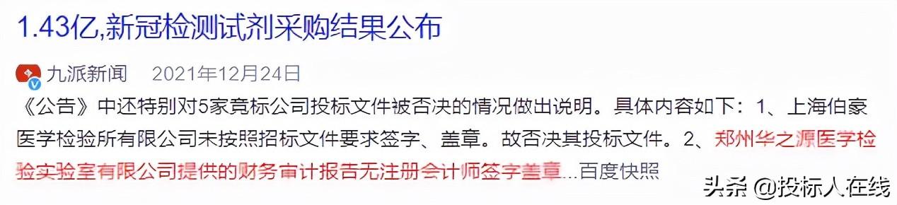 2、郑州华之源医学检验实验室有限公司提供的财务审计报告无注册会计师签字盖章,违反《财政部关于注册会计师在审计报告上签字盖章有关问题的通知》(财会【2001】1035号)“二、审计报告应当有两名具备相应业务资格的注册会计师签名盖章并经会计事务所盖章方为有效”的规定。故否决其投标文件。
