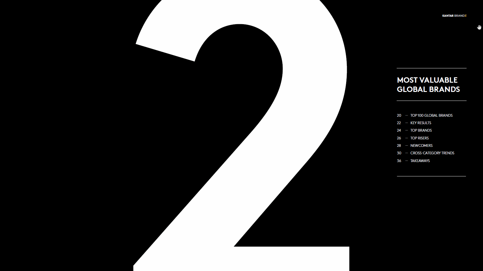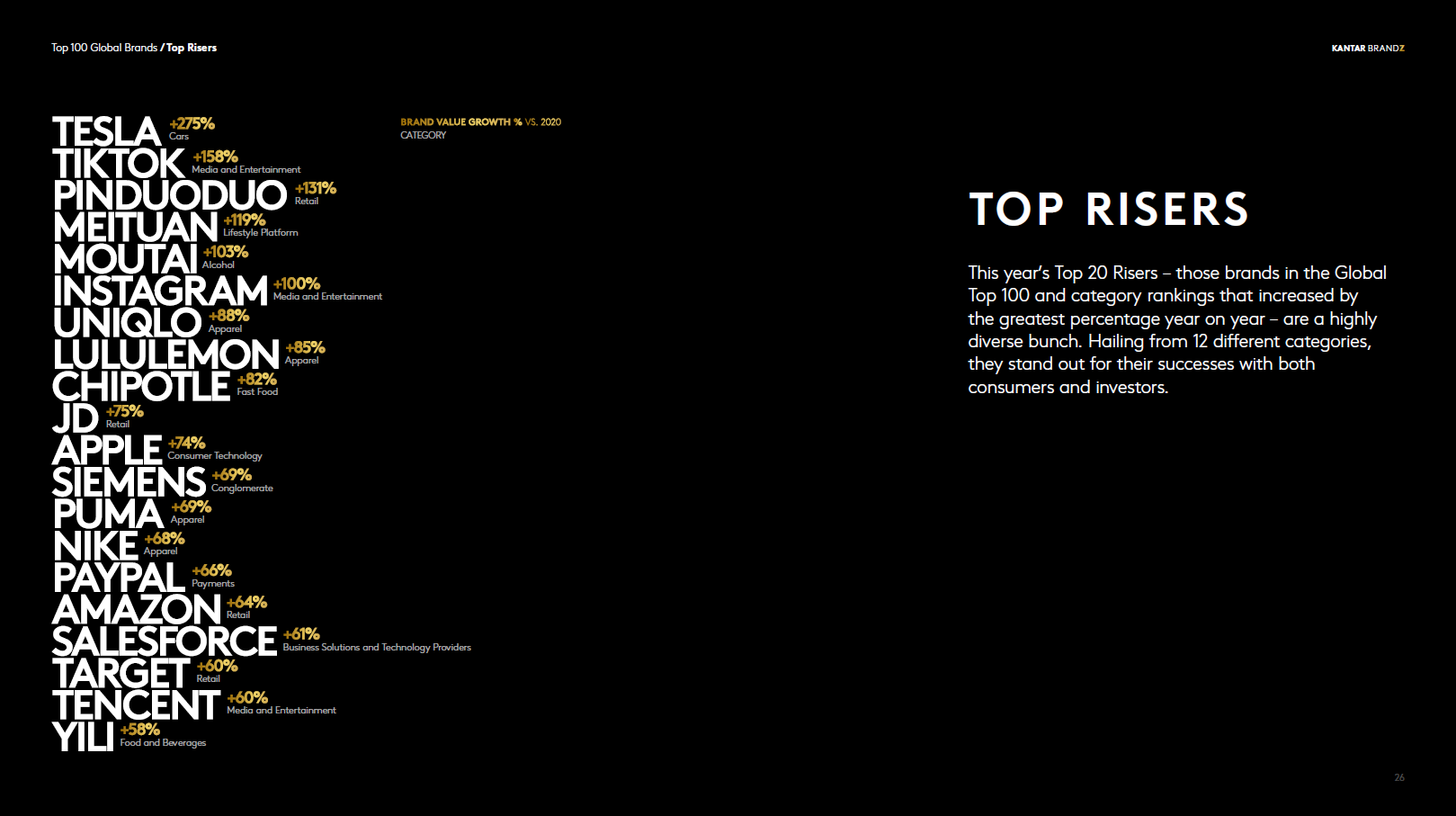 比如这一页,分析的是增长幅度最大的二十个品牌。它将品牌的名字,以较大的字号紧密排列,并用金色文字呈现相关数据: