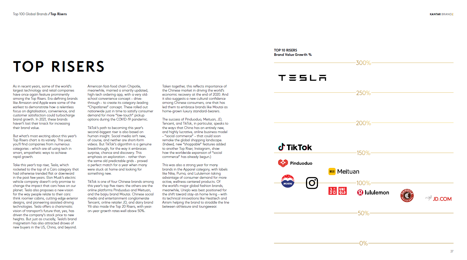比如这个页面,展示了10个上升品牌的增长幅度,所使用的是代表不同数字范围的线条,并排列品牌logo,具有一定的装饰性,让充满文字的页面,显得不那么拥挤: