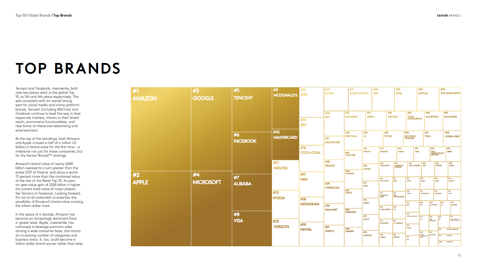 来看看这份报告的呈现方式,它用不同大小的形状,可视化地表现了每一个品牌的价值大小。