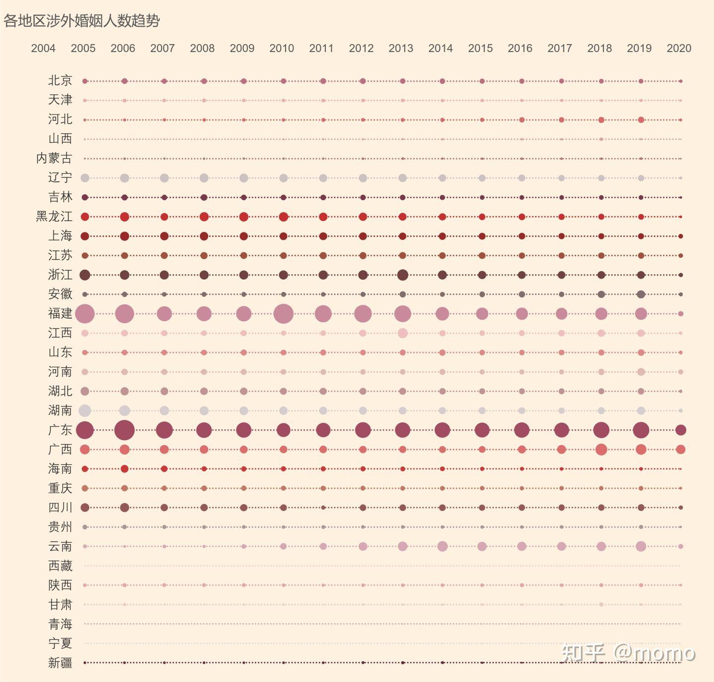 (2)2017年及之前,涉外婚姻以“外嫁”为主,2018-2020年,转变为以“外娶”为主。这种转变的主要直接原因是两广和中部地区突然大幅增加的“娶外国女性”现象,这里的外国女性很可能以东南亚新娘为主,也从侧面反映了内地男女比例失衡严重。