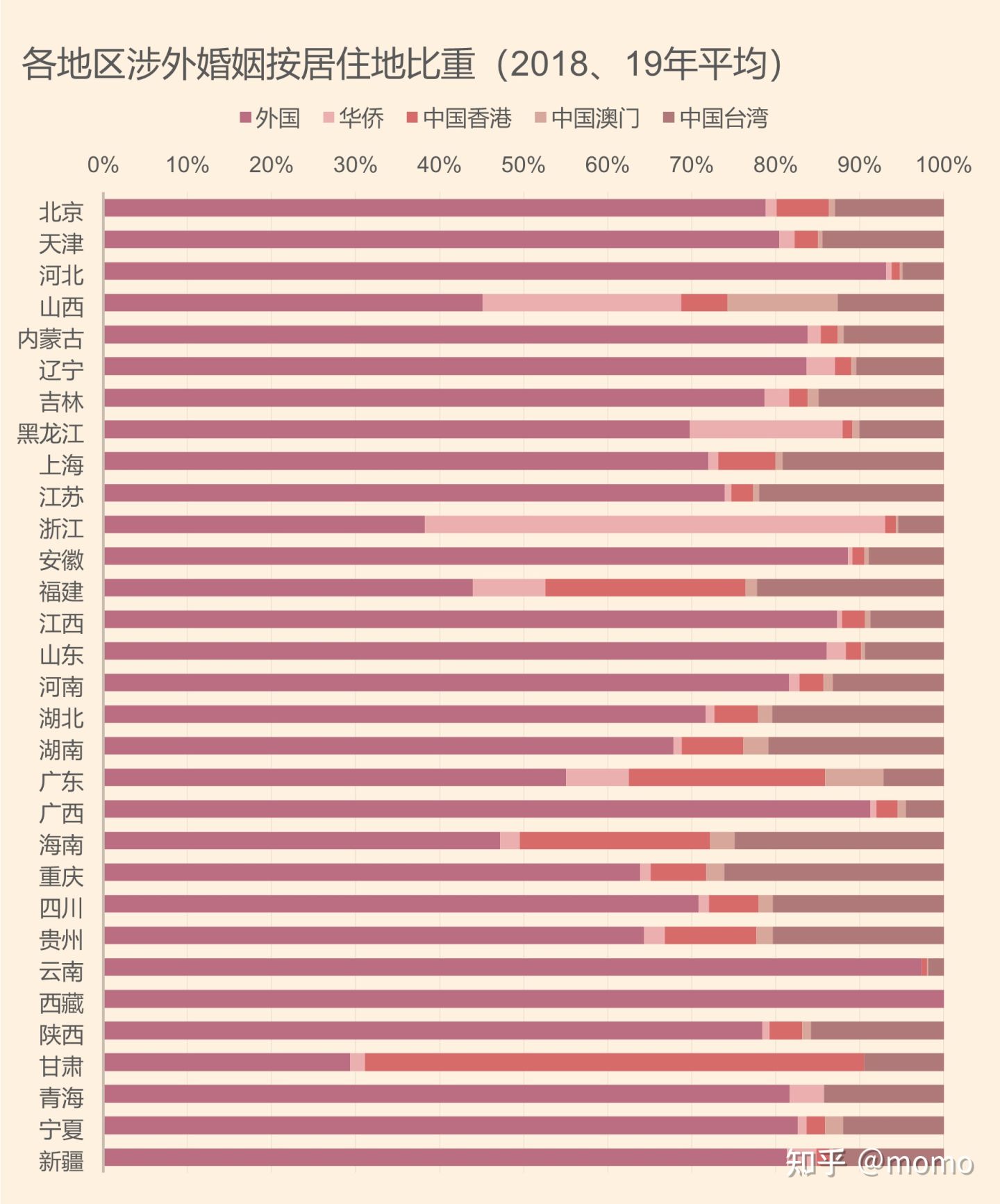(5)2018-19年平均按居住地划分的涉外婚姻类型(外国、华侨、中国香港、中国澳门和中国台湾)中,大部分省份涉外婚姻中外国人比重最高,浙江“偏爱”华侨、甘肃“偏爱”中国香港。