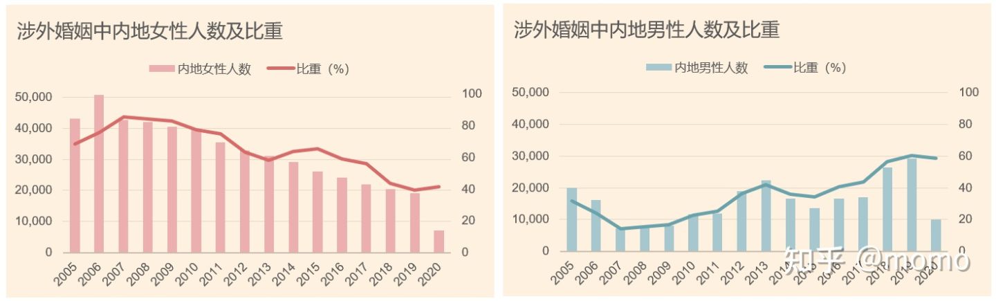 图2. 涉外婚姻中内地男性与女性居民人数及比重