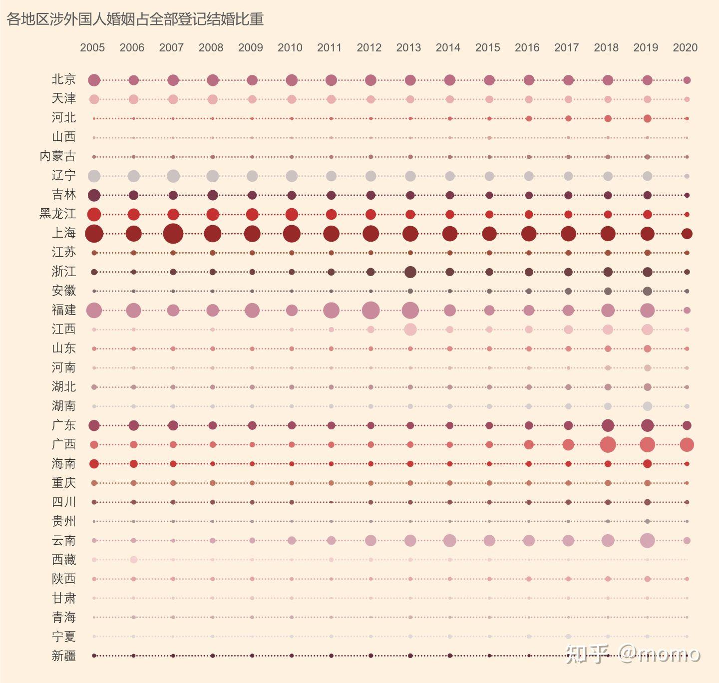 (4)上海涉外国人婚姻占全部婚姻比重长期位居各省份榜首,闽粤桂滇近几年直追上海。