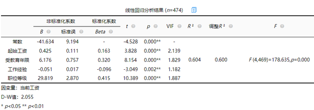 上图所示,回归方程的常数项约为-41.63,以及起始工资、受教育年限、工作经验以及职位等级的非标准化系数分别为0.425、6.176、-0.051、29.819。表中4个变量的p值均小于0.05,并且VIF值均正常,因此4个变量可以显示在模型中。