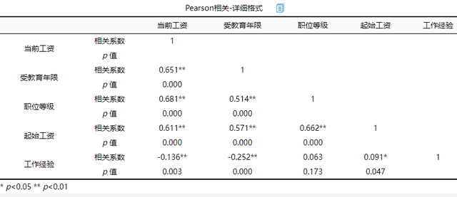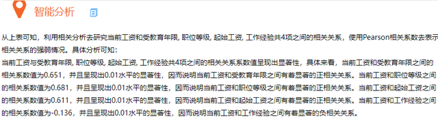 从上表可知,利用相关分析去研究当前工资和受教育年限, 职位等级, 起始工资, 工作经验共4项之间的相关关系,使用Pearson相关系数去表示相关关系的强弱情况。具体分析可知:当前工资与受教育年限, 职位等级, 起始工资, 工作经验共4项之间的相关关系系数值呈现出显著性。具体分析请看SPSSAU智能分析: