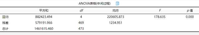 从上表可以看出,离差平方和为1461615.460,残差平方和为579191.966,而回归平方和为882423.494。回归方程的显著性检验中,统计量F=178.635,对应的p值远远小于0.05,被解释变量的线性关系是显著的,可以建立模型。建立模型后,需要查看模型拟合优度是否可以,其中就可以查看R方与调整R方值。