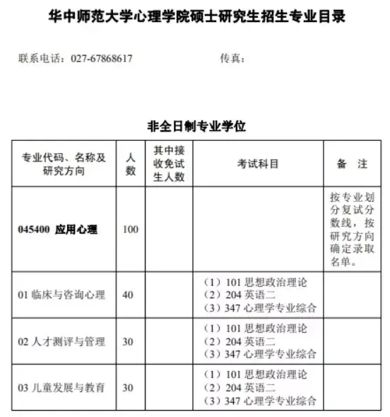 之前华中师范大学放出了科目预告,心理学专硕改为非全日制招生。大家估计应该知道了。现在华师正式版的招生简章专业目录已经出来了。