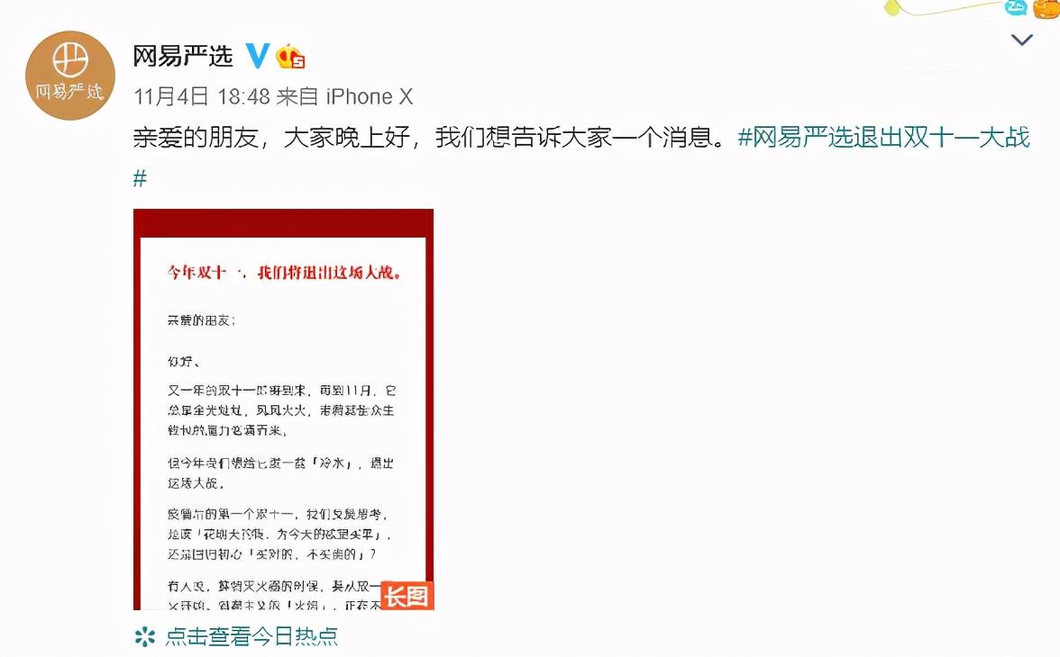 2020双11,在全部购物平台使出浑身解数让人“买买买”的时候,网易严选高调宣布“退出双11大战”,“退出的是这个鼓吹过度消费、为销售数字狂欢的双十一”,同时劝导大众要“理性消费”。