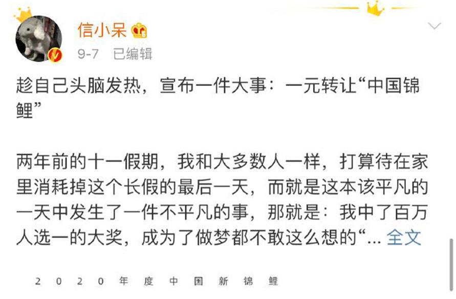 支付宝锦鲤信小呆在微博上发起了1元转让“中国锦鲤”的活动,引发了网友关注。