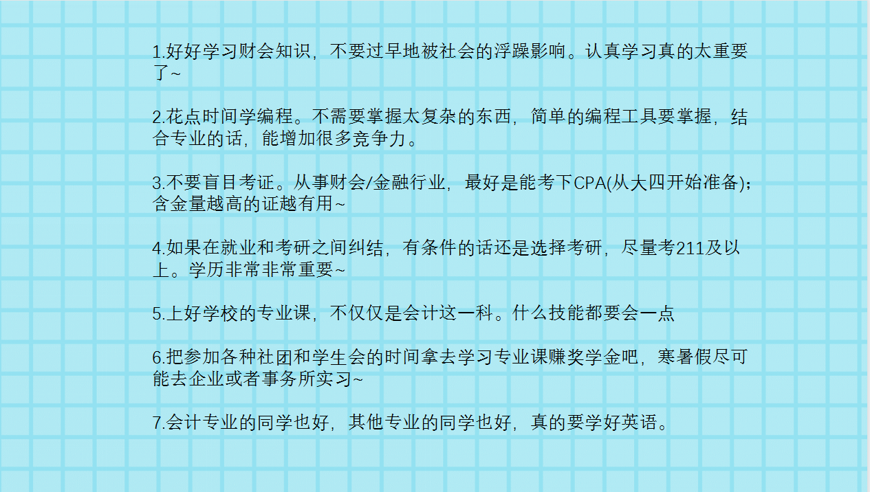 ①首先在大学期间一定要学好专业课知识,这是很重要的,不要觉得课本上的知识很简单,会计实务理论知识学扎实了是你自己的本事。