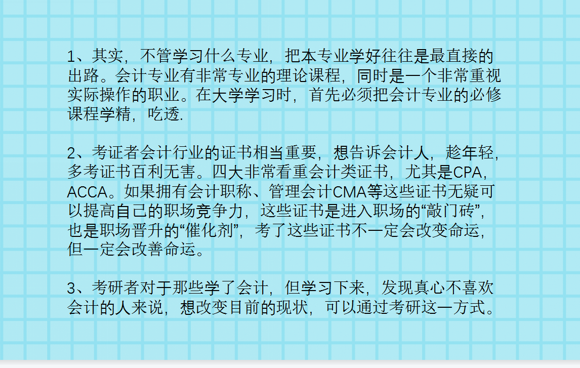 ③往上继续学习,如果你大一大二考了会计初级证书的,建议看注会注册会计师争取大四毕业的时候报名考试,越早考过越好,这个证书含金量还是挺高的。