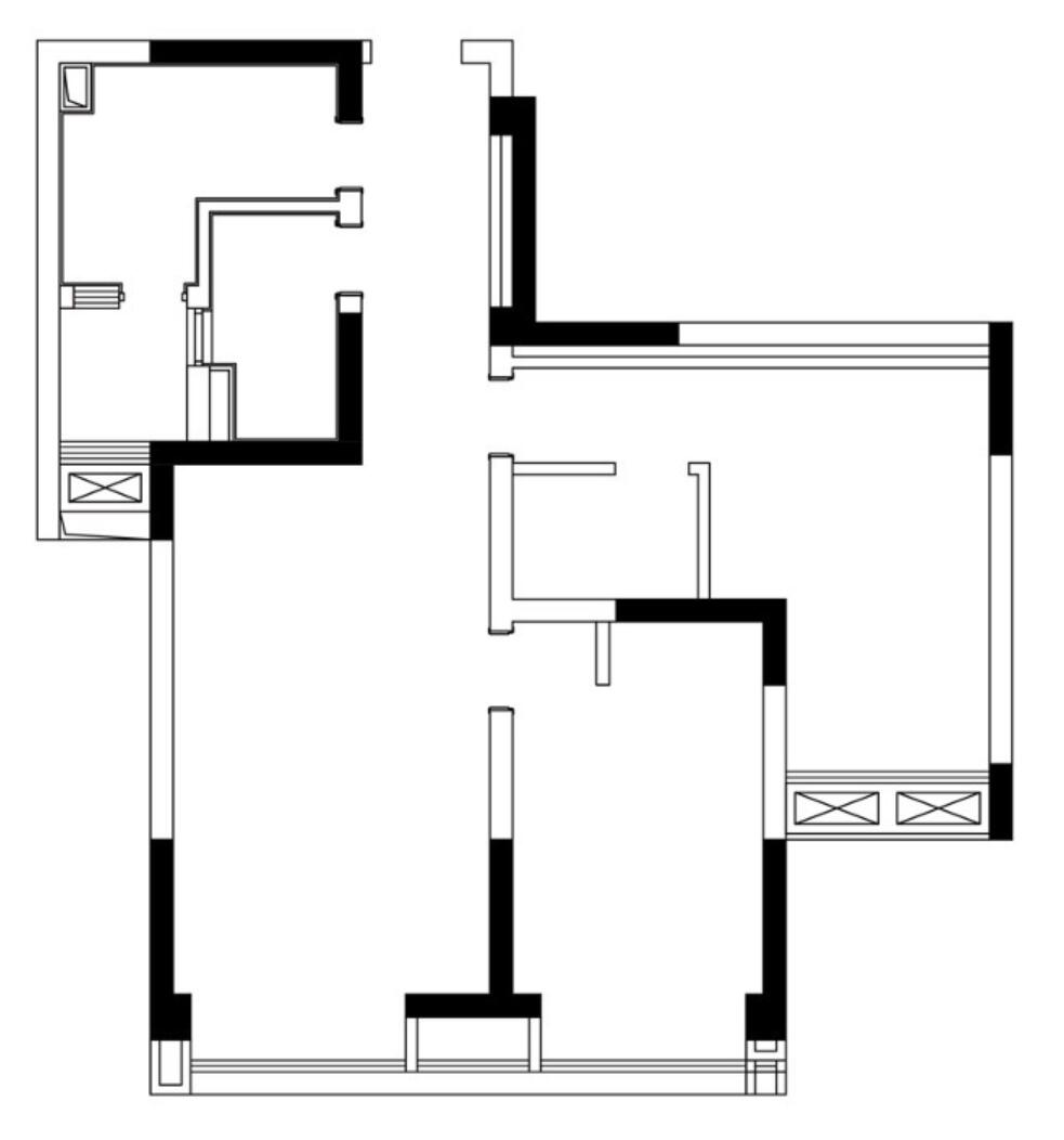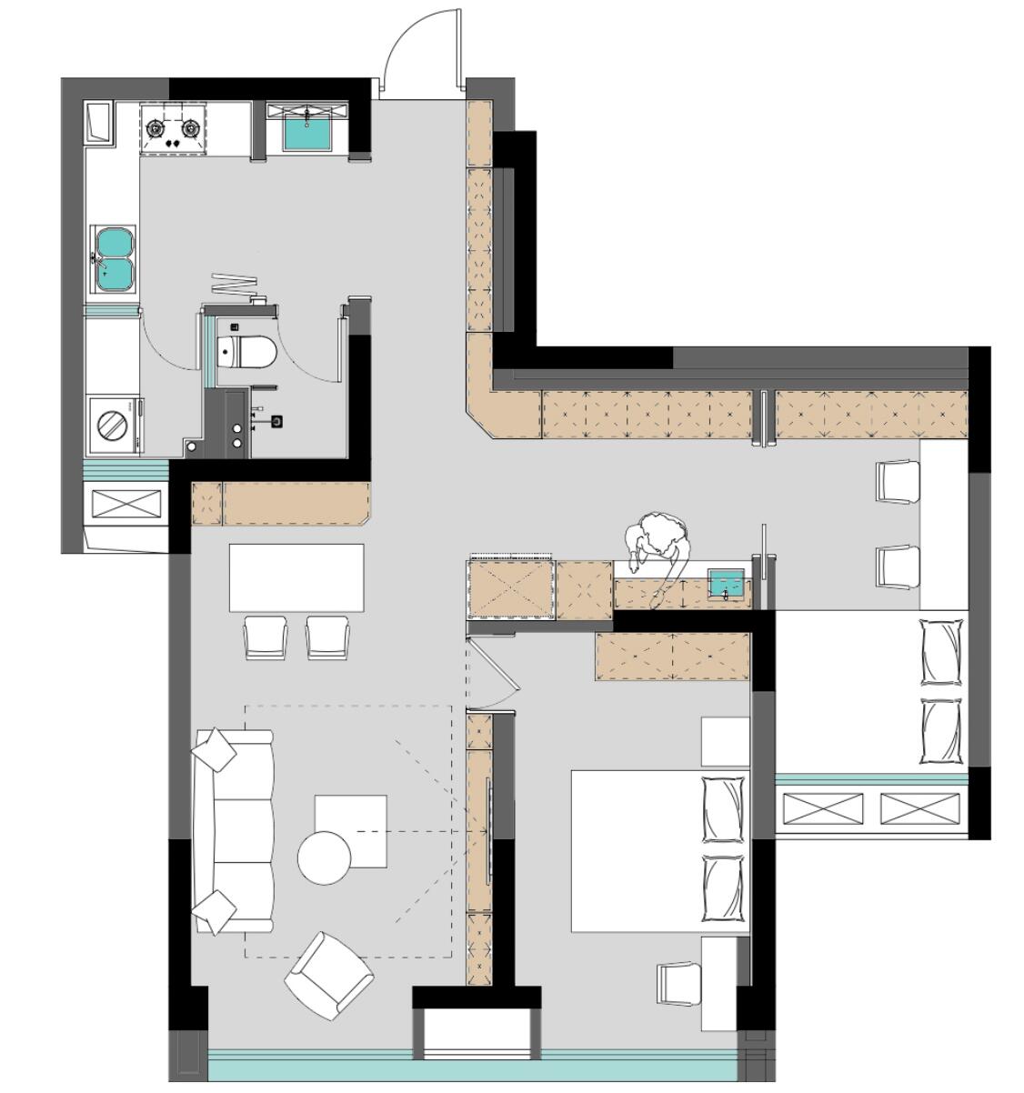 原户型的结构相当具有侵略性和局促性,空间利用率很低。比如L型厨房导致家居动线严重拥堵;比如次卧衣帽间的存在,利用率太低。