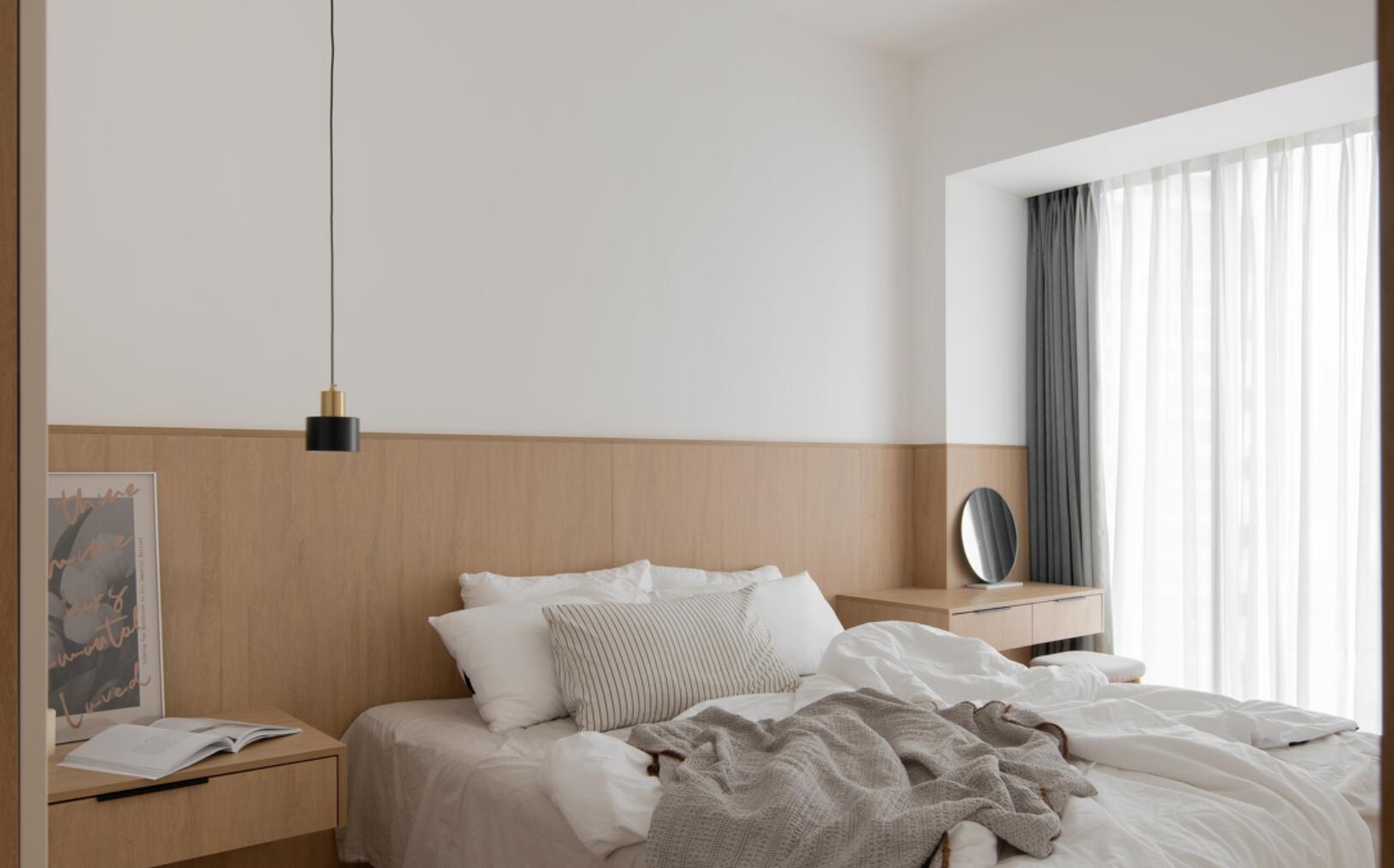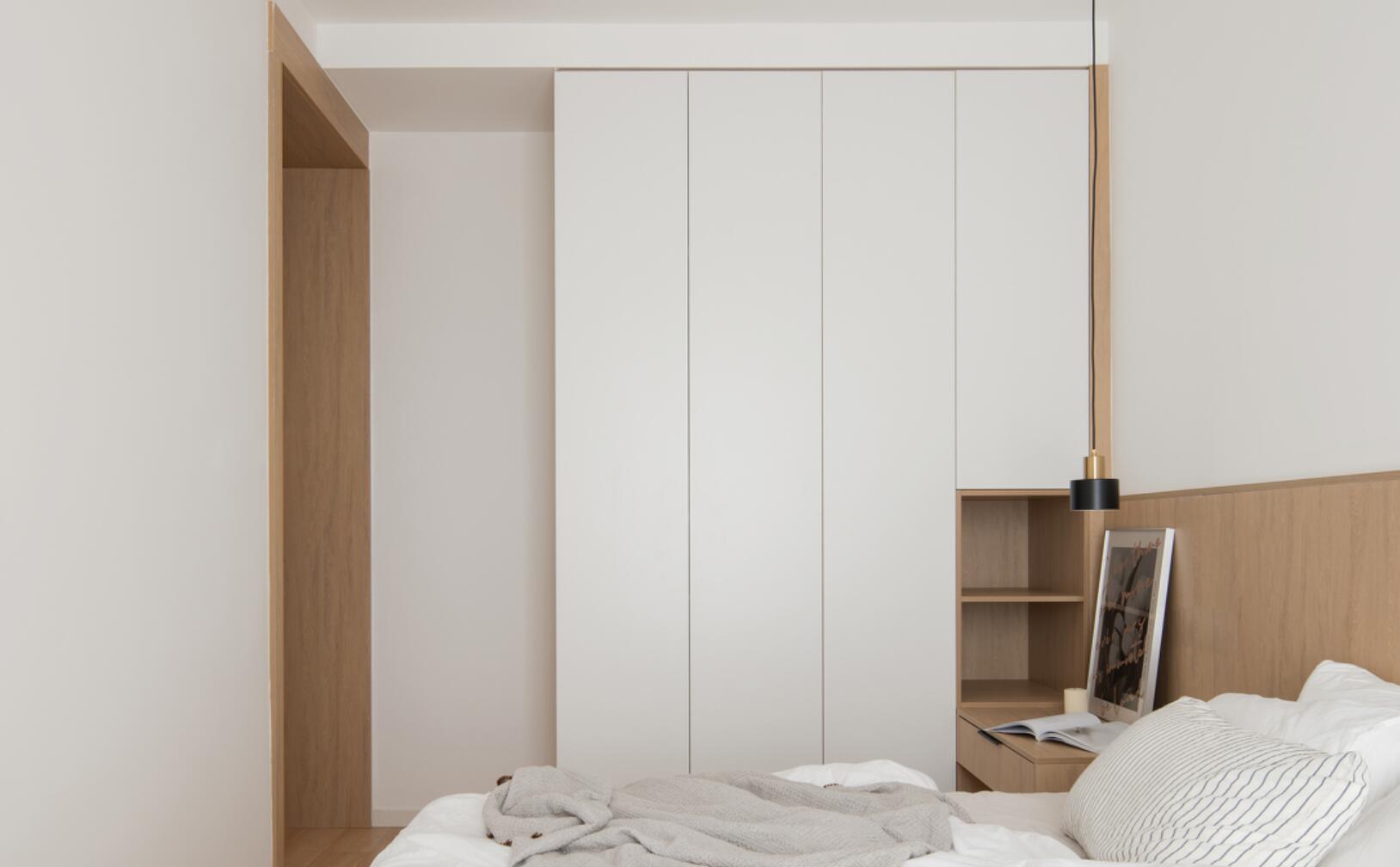 来到主卧,墙面还是以大面积泛白为主。搭配一体式原木床头,看起来很清爽,功能也很丰富。比如左边床头柜和衣柜做一个整体,避免打不开柜门的尴尬;比如右边的床头柜就有梳妆台的功能。